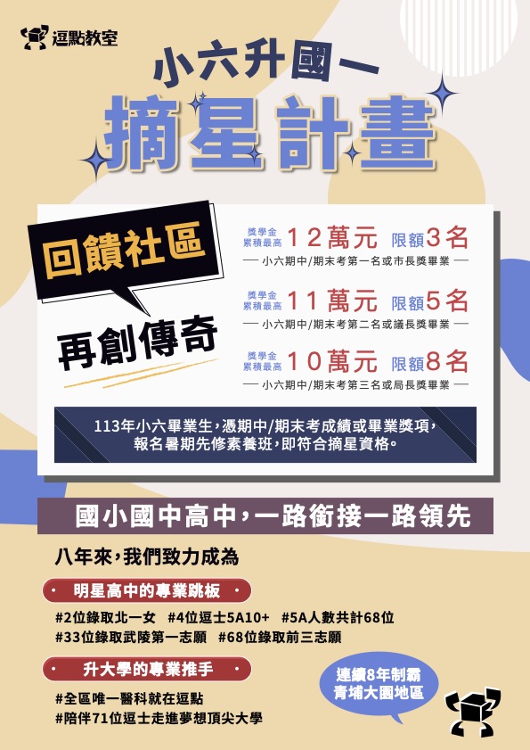 112年小六畢業生,憑期中/期末考成績或畢業獎項,報名暑期先修全人班,即符合摘星資格