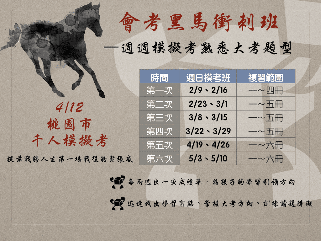 模擬考科目的順序仿會考,使孩子事前感受大考的實際氛圍,逐次消彌緊張。模擬考試中皆包含學生較缺乏練習的數學非選與英語聽力。