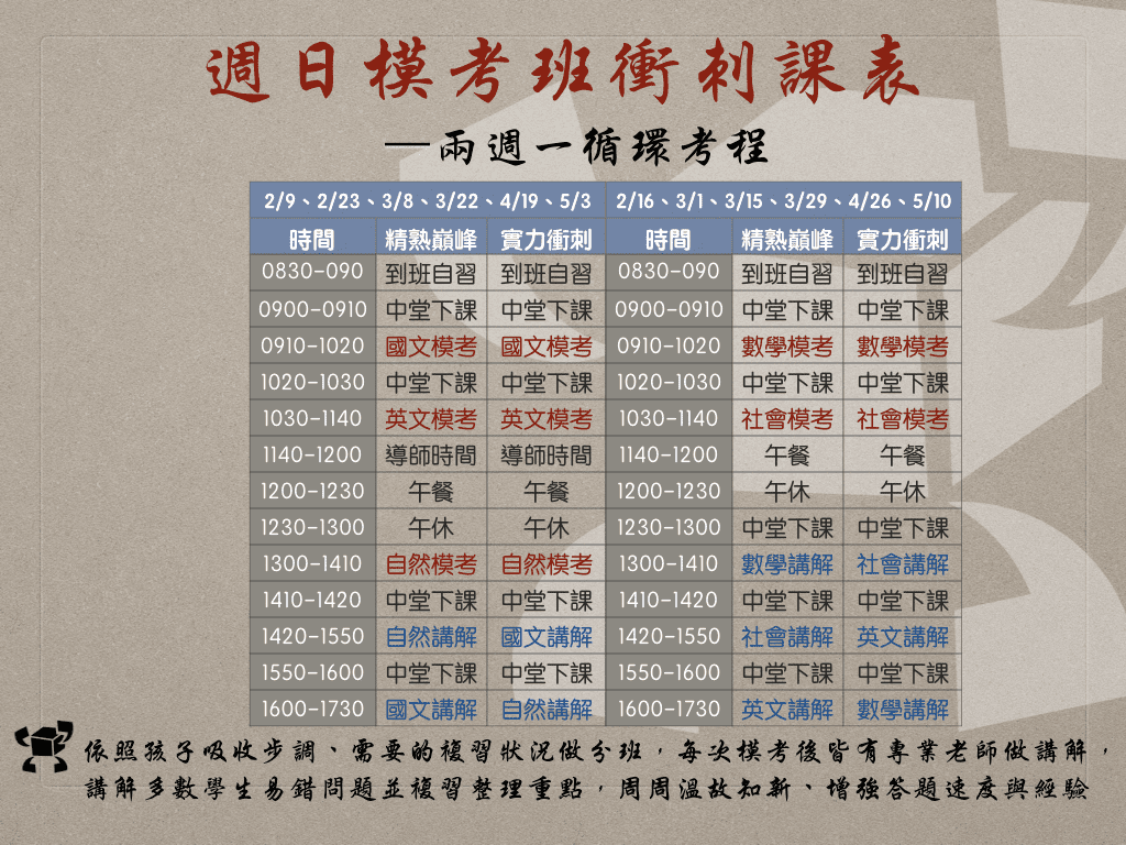 每次模擬考後皆有老師專業講解,針對多數學生易錯問題進行解說並將觀念重點整理。藉由每次模擬考,有計畫性的逐步擴大練習,依照孩子的學習步調、需要複習的範圍與狀況進行分班,週週溫故知新,增強答題速度與經驗。