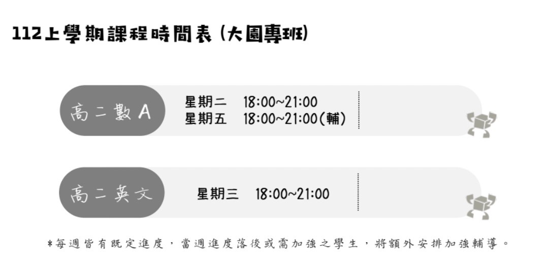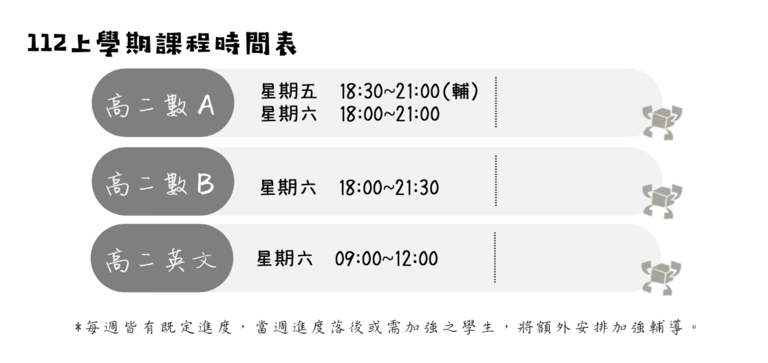 配合高中升學趨勢,提供學生所需。專業教學,扎實輔導,締造非凡紀錄!週週安排加強輔導,緊扣每一個學習環節。